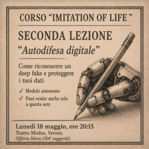 Abbiamo pensato di fare un corso in tre moduli autonomi sull’IA, la menzogna e la libertà. Perché? Perché non ne potevamo più di sentire “l’IA farà questo”, “l’IA farà quello”, mentre nessuno spiega un cavolo di come si difende un telefono, si riconosce un deep fake o si smonta una notifica che ti vuole tenere incollato allo schermo come un pesce alla lenza.